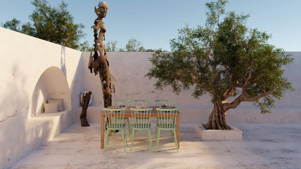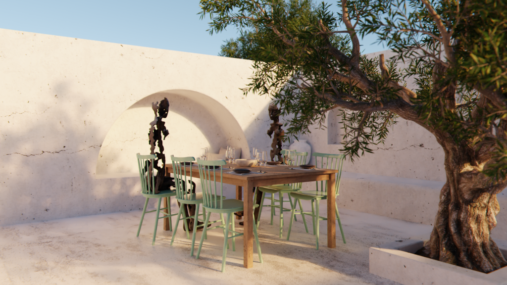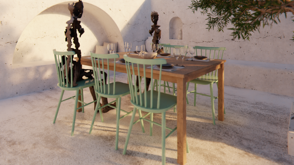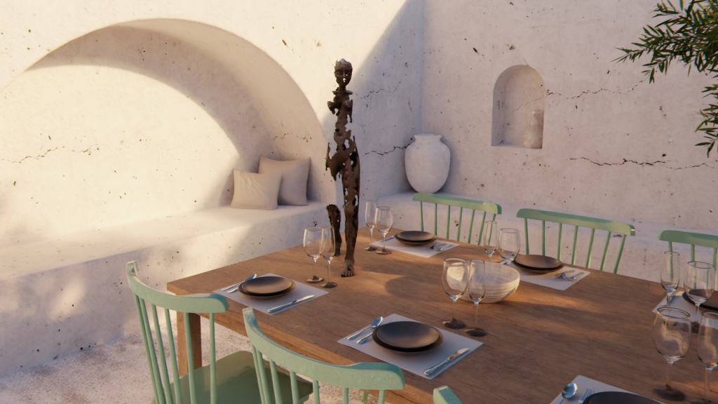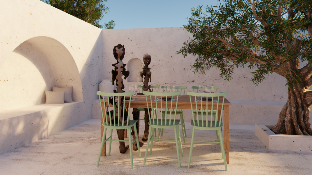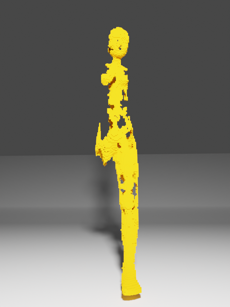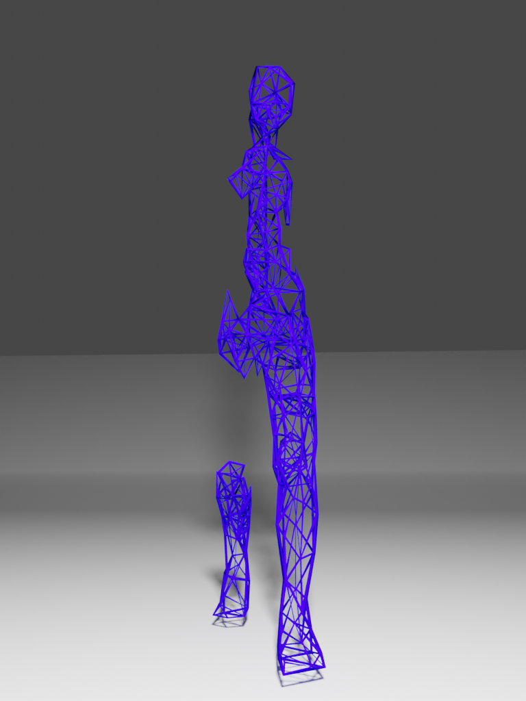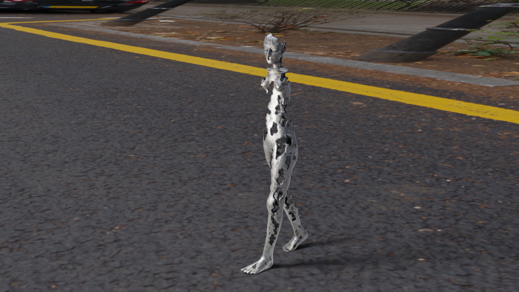 Mit den Mitteln der Spieleindustrie kann man einen digitalen Zwilling in beliebigen Posen in der Scene aufstellen. Die Figur, die im Original in einer gehenden Bewegung erstarrt ist, kann so an einem Tisch sitzen.