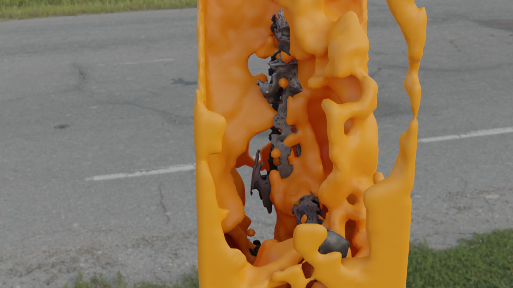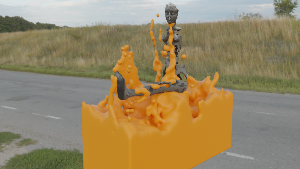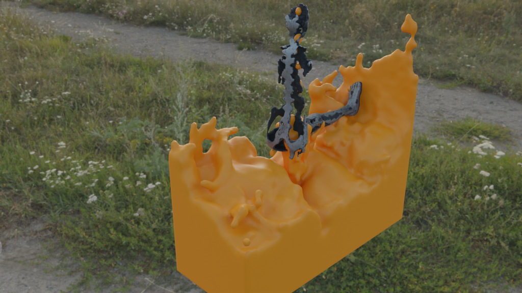 Genauso wie ein digitaler Zwilling in beliebige Scenen integriert werden kann, so kann er auch mit beliebigen anderen Objekten oder Stoffen kombiniert werden. Hier am Beispiel von einer Flüssigkeit
